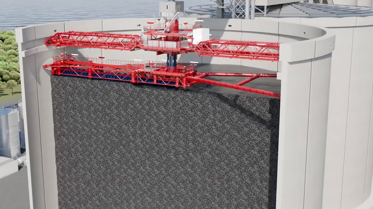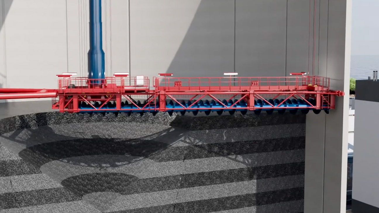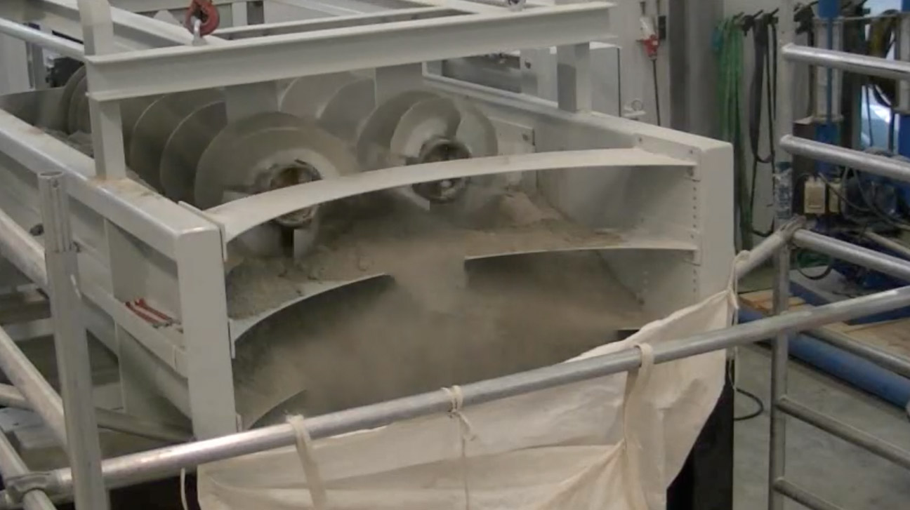 Infeed from the top through a telescopic shute. Outfeed at the bottom via a slotted central column. Suitable for cohesive or hygroscopic material such as FGD Gypsum or Ammonium Sulphate.